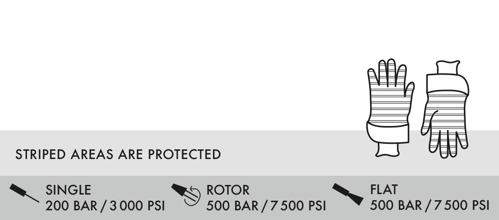 ●水射流防护手套,防护等级高达 500 bar / 7,500 psi。