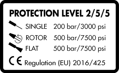 操作员必须明确知晓防护服的防护部位及其对应的防护功能。条纹面料清晰标识出防护区域,标签则注明防护等级。白色标签表示该防护服可抵御2,00 bar/3,000 psi单束射流、5,00 bar/7,500 psi旋转射流以及5,00 bar/7,500 psi扇形射流的压力——对应防护等级2/5/5。