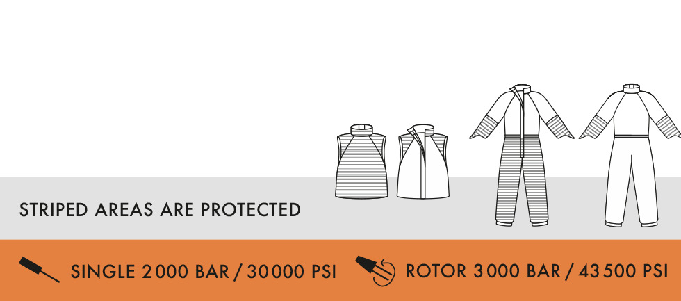 操作员必须明确知晓防护服的防护部位及其对应的防护功能。光面织物清晰标识出防护区域,标签则注明防护等级。橙色标签表示该防护服可抵御2,000 bar/30,000 psi单束射流及3,000 bar/43,500 psi旋转射流的压力——对应防护等级20/30。
