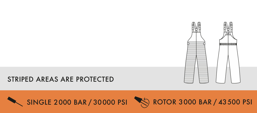 操作员必须明确知晓防护服的防护部位及其对应的防护功能。光面织物清晰标识出防护区域,标签则注明防护等级。橙色标签表示该防护服可抵御2,000 bar/30,000 psi单束射流及3,000 bar/43,500 psi旋转射流的压力——对应防护等级20/30。