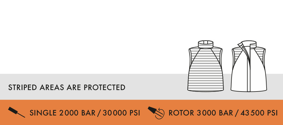 操作员必须明确知晓防护服的防护部位及其对应的防护功能。光面织物清晰标识出防护区域,标签则注明防护等级。橙色标签表示该防护服可抵御2,000 bar/30,000 psi单束射流及3,000 bar/43,500 psi旋转射流的压力——对应防护等级20/30。