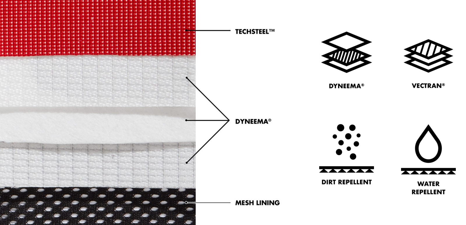 外层采用Techsteel™科技面料,兼具防污与防水特性,确保操作员全天保持干爽轻便。该面料具备极高的耐磨抗撕裂性能,马丁代尔耐磨测试值超过50万次。外层材料还通过Vectran®(液晶聚合物)加强,实现卓越的强度与耐用性。这些性能需求最初源于混凝土拆除与爆破行业。