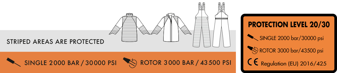 操作员必须明确知晓防护服的防护部位及其对应的防护功能。光面织物清晰标识出防护区域,标签则注明防护等级。橙色标签表示该防护服可抵御2,000 bar/30,000 psi单束射流及3,000 bar/43,500 psi旋转射流的压力——对应防护等级20/30。