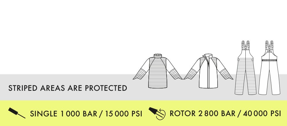 操作员必须明确知晓防护服的防护部位及其对应的防护功能。条纹面料清晰标识出防护区域,标签则注明防护等级。黄色标签表示该防护服可抵御1,000 bar/15,000 psi单束射流及2,800 bar/40,000 psi旋转射流的压力——对应防护等级10/28。